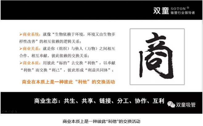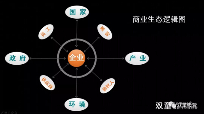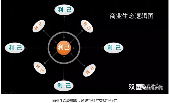將“商業(yè)的本質(zhì)”與“人性”剖析清楚后,樓總將一幅商業(yè)生態(tài)邏輯圖展現(xiàn)在大家面前,抽絲剝繭地將商業(yè)邏輯完整地講解出來:人與他人(天下萬物)之間存在彼此交換的過程,你對員工的態(tài)度、對社會的態(tài)度、對環(huán)境的態(tài)度、對資源的態(tài)度、對他人的態(tài)度(包含競爭對手),換取了“他人”對你的態(tài)度,這也是利他的背后一定是利已的商業(yè)本質(zhì)!