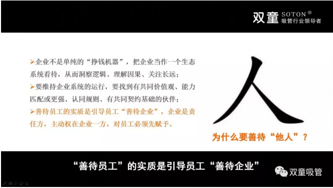 同時,樓總也引導(dǎo)同學(xué)們透過現(xiàn)象看本質(zhì),“雙童”之所以15年前建設(shè)節(jié)能降耗系統(tǒng),消滅所有的污染排放是因為“雙童”看的很遠,用“利他”去獲得“利已”!