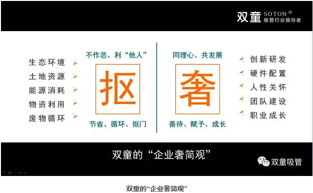 在商業(yè)本質(zhì)的認知下,“雙童”形成了自己獨特的企業(yè)“奢簡觀”:公司在建廠之初建設(shè)了雨水收集、廢水處理、垃圾回收等節(jié)能降耗設(shè)施,通過這樣創(chuàng)新的方式把生產(chǎn)做到了零排放。與此同時,建設(shè)花園式工廠,提高土地利用率,對能源、物資追求產(chǎn)出最大化,對廢物不斷循環(huán)利用,從而每年“摳”出數(shù)百萬元,“奢侈”地用在創(chuàng)新研發(fā)、硬件配置以及對員工的人性關(guān)懷、團隊建設(shè)上,和團隊一起共發(fā)展!