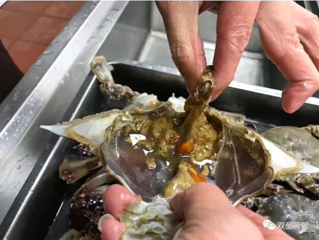 十二、取出砂囊后將蟹身兩側(cè)的蟹鰓(看上去像魚鰓)用手工拔除干凈,如果蟹鰓底部有烏黑砂子,千萬不要用清水沖洗,用干凈牙刷局部清洗一下就可以了。