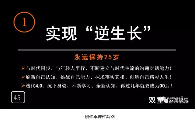 追隨者:我們所“遇見(jiàn)”的這個(gè)時(shí)代面臨著破局、顛覆、巨變、迭代…… 老一代管理者本質(zhì)上與90后員工存在著一條巨大的“鴻溝”,這條“鴻溝”就是對(duì)現(xiàn)代知識(shí)的認(rèn)知。年輕人學(xué)習(xí)知識(shí)有先天的優(yōu)勢(shì),所以,當(dāng)家人樓仲平一直堅(jiān)持向年輕人學(xué)習(xí),創(chuàng)建與年輕人對(duì)話和溝通的能力,永遠(yuǎn)將自己定位在25歲,緊追時(shí)代步伐,不讓自己成為時(shí)代的“棄兒”!