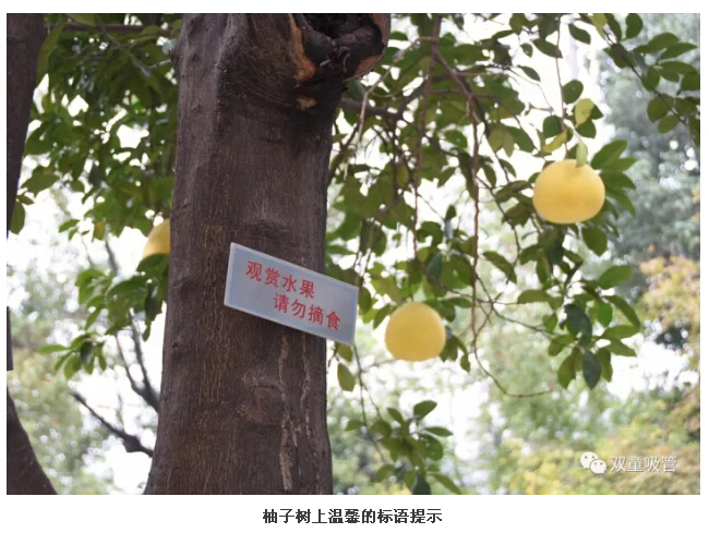 原來,為了“雙童”的生態(tài)和美觀,公司明確柚子是觀賞性水果,每棵柚子樹上都有“觀賞水果,請(qǐng)勿摘食”的字樣,提醒和引導(dǎo)員工不要摘食觀賞水果。