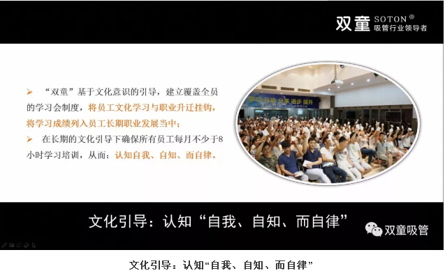從企業(yè)經(jīng)營的角度來說,“雙童”就極為重視“文化載體”的維護和調(diào)整,建立了以“價值觀傳播”、“閃亮點傳播”、“自媒體傳播”的文化傳播體系。如:“雙童”基于文化意識的引導,建立覆蓋全員的學習會制度。在長期的文化引導下確保所有員工每月不少于8小時學習培訓,從而引導員工們認知自我、自知、而達到自律。
