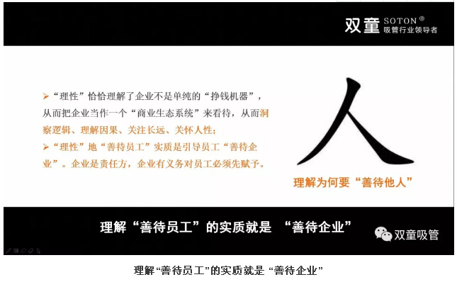 需要注意的是,所謂的“理性經(jīng)營”絕非是不講情理,更非冷血動物……“理性”關注的是“人性”所需,“雙童”建立以“人”和“家”為中心的人性化管理模式,“理性”地“善待員工”,實質(zhì)是引導員工“善待企業(yè)”。