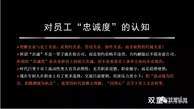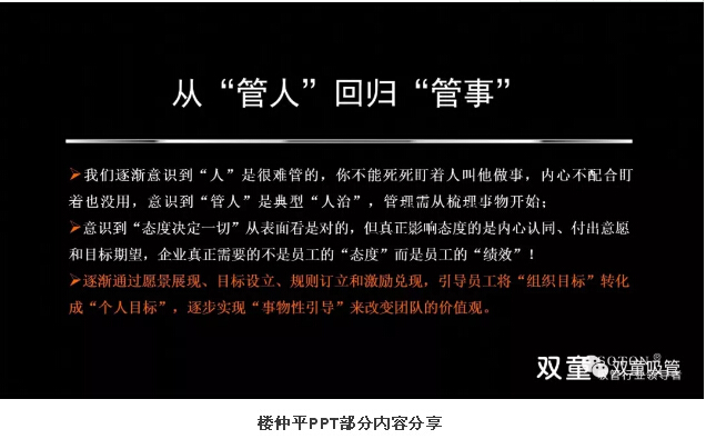 在“理性”思維的持續(xù)引導下,“雙童”在文化中倡導把員工看成是平等、完整的“人”,而非站在道德高地上居高臨下。在“雙童”的文化呈現(xiàn)、氛圍營造和溝通方式上,處處體現(xiàn)了“理性”思維,通過愿景展現(xiàn)、目標設立、規(guī)則訂立和激勵兌現(xiàn),引導員工將“組織目標”轉(zhuǎn)化成“個人目標”,逐步實現(xiàn)“事物性引導”來改變團隊的價值觀。所以,管理不是管控、教條和賦予,而是激發(fā)和釋放每個人的善意,幫助員工成長、激發(fā)其創(chuàng)造,在共同追求中形成一致的價值和理念認同。