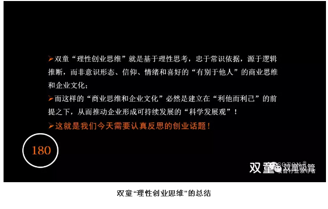 最后,樓仲平也對雙童“理性創(chuàng)業(yè)思維”進行了總結:它就是基于理性思考,忠于常識依據(jù),源于邏輯推斷,而非意識形態(tài)、信仰、情緒和喜好的“有別于他人”的商業(yè)思維和企業(yè)文化;而這樣的“商業(yè)思維和企業(yè)文化”必然是建立在“利他而利己”的前提之下,從而推動企業(yè)形成可持續(xù)發(fā)展的“科學發(fā)展觀”!