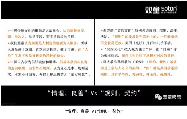 在中國這樣的大環(huán)境下,我們會用情理、良善去認(rèn)知管理。中國傳統(tǒng)文化的根源是人治社會,倡導(dǎo)“熟人文化”,認(rèn)為情最重要,理、法次之。中國自古極為倡導(dǎo)誠信和道德,但基本靠內(nèi)心良善的意識喚醒、而非外在規(guī)則,從而導(dǎo)致“煽情式”管理大行其道:無視責(zé)、權(quán)、利平衡,大談無私奉獻(xiàn)、感恩付出、大善大愛,諸不知人性中“情感”只能短期激發(fā),長期持續(xù)必然導(dǎo)致精神麻痹!