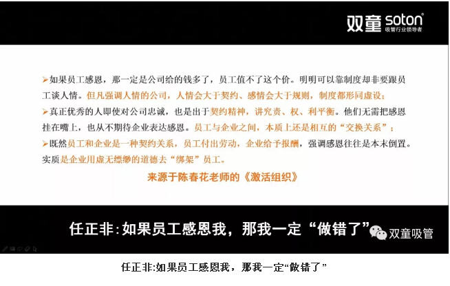 正是受到西方“理性思維”的影響和推動,“雙童”創(chuàng)立了一套組織關(guān)系哲學(xué)。弱化血緣關(guān)系,強(qiáng)化規(guī)則關(guān)系;弱化人情關(guān)系,強(qiáng)化契約關(guān)系;弱化個人關(guān)系,強(qiáng)化團(tuán)隊關(guān)系;弱化社交關(guān)系,強(qiáng)化社會關(guān)系……從而突破“道德”認(rèn)知、回歸“理性”本源!