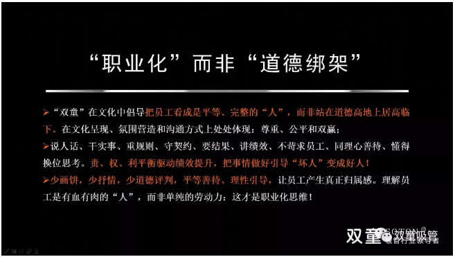 在“理性”思維的持續(xù)引導(dǎo)下,“雙童”在文化中倡導(dǎo)把員工看成是平等、完整的“人”,而非站在道德高地上居高臨下。在“雙童”的文化呈現(xiàn)、氛圍營造和溝通方式上,處處體現(xiàn)了“理性”思維,通過愿景展現(xiàn)、目標(biāo)設(shè)立、規(guī)則訂立和激勵兌現(xiàn),引導(dǎo)員工將“組織目標(biāo)”轉(zhuǎn)化成“個人目標(biāo)”,逐步實現(xiàn)“事物性引導(dǎo)”來改變團(tuán)隊的價值觀。所以,管理不是管控、教條和賦予,而是激發(fā)和釋放每個人的善意,幫助員工成長、激發(fā)其創(chuàng)造,在共同追求中形成一致的價值和理念認(rèn)同!