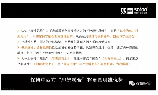 最后,樓仲平也引導(dǎo)大家在認(rèn)知“理性思維”時并不表示需要全盤接受西方的“純理性思維”。用中國人的感性思維來解決在生活中、家庭中的人際關(guān)系,用西方“理性思維”的邏輯推理來解決企業(yè)經(jīng)營過程中的方方面面,從而達(dá)到中西方兩種思想的融合!大體上保持“理性”(管理經(jīng)營上),理性中帶點“感性”(人際關(guān)系上),偶爾來點“非理性”(創(chuàng)新求變上),用“儒家中庸”與“邏輯變革”融會貫通、為我所用!