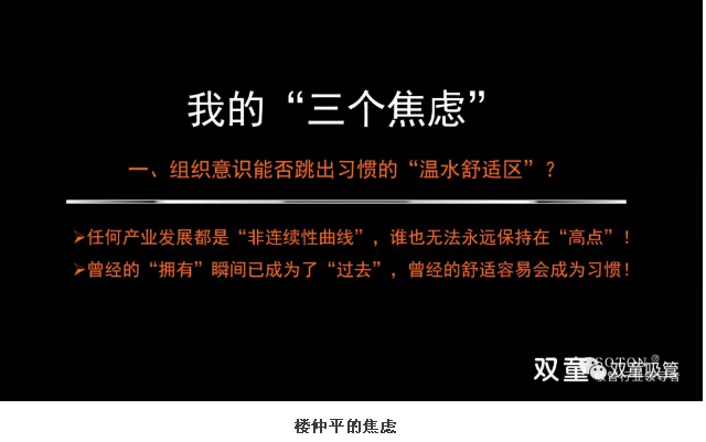 各位創(chuàng)業(yè)者們,你是否還沉迷在過(guò)去的輝煌?你是否還留戀過(guò)往的成功?你是否還在沾沾自喜自己的成就?如果是,也許你已經(jīng)成為那只溫水里的青蛙,沒(méi)有意識(shí)到自己的危險(xiǎn),最終難逃生于憂(yōu)患,死于安樂(lè)!近些年,“雙童”樓仲平也深刻體會(huì)到高速變化的時(shí)代所帶來(lái)的焦慮,他不愿再談過(guò)往、經(jīng)驗(yàn)和成績(jī)……這究竟是怎么回事呢?下面,吸管妞就和大家分享在時(shí)代的變化下,樓仲平的三個(gè)焦慮!