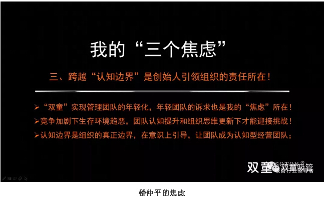 樓仲平的第三個(gè)焦慮:2011年,“雙童”明確“再造經(jīng)理人”計(jì)劃,選拔培養(yǎng)年輕領(lǐng)導(dǎo)層,管理團(tuán)隊(duì)更加年輕化,“雙童”管理團(tuán)隊(duì)也更加年輕、有斗志,有激情。但當(dāng)我看到這批年輕的管理團(tuán)隊(duì)臉上洋溢著對(duì)未來(lái)的期待、渴求和夢(mèng)想的時(shí)候,我明白他們現(xiàn)在正“嗷嗷待哺”,我需要給他們創(chuàng)造更大的空間和更廣闊的平臺(tái),我產(chǎn)生了無(wú)限的壓力和焦慮。我要思考如何創(chuàng)造空間,讓他們實(shí)現(xiàn)更大的夢(mèng)想,我不能讓我的邊界限制企業(yè)的未來(lái)十年,不能讓我的邊界限制年輕有為的管理團(tuán)隊(duì)!