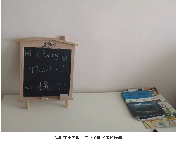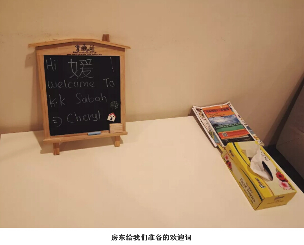 搭乘晚上的飛機回到亞庇,我們提前一天在愛彼迎上訂好了套房。下面必須安利一波我們在亞庇住的套房!這個Lazy.Elephant套房,它位于哥打京那巴魯市,是中央商務(wù)區(qū)天空套房。它不僅有兩扇大大落地窗可以觀賞城市景觀和絕美日落,還能共享sky hotel的INFINITY游泳池,健身房和天空休息室!有這樣的套房,可以提供六人居住,一晚只要500左右人民幣,太適合家庭或者組團居住了!房東Chery人超好,因為我們到亞庇已經(jīng)十一點多了,她怕我們找不到地方,把每一個需要拐彎和注意的地方都用照片拍下來標(biāo)注好箭頭,提醒我們應(yīng)該怎么走。到達房間后,能夠看到她在客廳小黑板上寫了歡迎詞,貼心的寫了姐姐的中文字“媛”,讓人一進門就感覺特別溫暖。