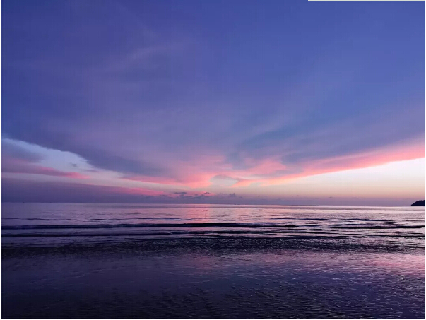 到了太陽快下山時,我們也回到了沙灘上。只見一輪紅日慢慢向山那邊落下去,云彩也被映襯得金黃金黃的,倒映在水中的光也讓人頭暈?zāi)垦?,睜不開眼。沒幾分鐘,太陽就下山了。就當(dāng)我們覺得“世界上最美的落日”也就是不過如此時,神奇的事發(fā)生了!太陽下山以后,刺眼的光芒也不見了,而留下來的云朵開始了他們的表演,演變成了黃色、藍(lán)色、紫色,不斷變幻,像是打翻了顏料盤后幾種顏色混到了一起。瑰麗的云層壓得很低,似乎和大海連到了一起,海天一色。此情此景,讓每個人的心都變得柔軟起來。此時此刻,無語也溫暖,平凡也浪漫。