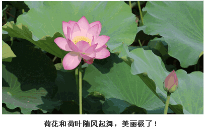 在微風的吹拂下,荷花和荷葉隨風擺動。整個花隨風舞,風讓花舞的景象,構成一幅夏日小荷動圖。憶起以前讀過的一首詩,“荷花宮樣美人妝,荷葉臨風翠作裳?!痹娎锏拿谰霸诖丝陶芾毂M致地展現在眼前,真是讓人嘆為觀止!