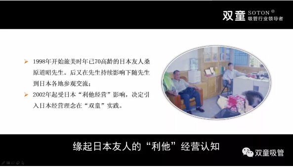 1998年,“雙童”樓仲平通過(guò)業(yè)務(wù)關(guān)系結(jié)識(shí)了一位旅美日本友人桑原道昭先生。桑原道昭先生在美國(guó)待了45年,會(huì)一點(diǎn)漢語(yǔ)。他會(huì)和樓仲平交流做生意的看法,并用日本人的視角和思想解讀節(jié)能環(huán)保、節(jié)約土地、員工關(guān)懷等方面的話(huà)題。在交流過(guò)程中,32歲的樓仲平與當(dāng)時(shí)已經(jīng)70歲高齡的桑原道昭先生成為了忘年交,此后便開(kāi)啟了樓仲平不斷去日本參觀的學(xué)習(xí)之旅。在看過(guò)無(wú)數(shù)日本企業(yè)對(duì)自然環(huán)境、資源循環(huán)利用等方面的做法后,日本“利他”經(jīng)營(yíng)的管理理念深深影響了樓仲平的商業(yè)思維。于是,當(dāng)2003年新建廠房的機(jī)會(huì)來(lái)臨,樓仲平便立志要將“雙童”建設(shè)為一個(gè)生態(tài)、環(huán)保、無(wú)污染、無(wú)排放的花園式工廠。