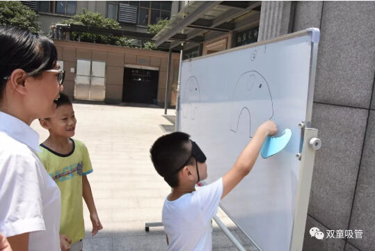 上午11:00,“雙童”的寶貝們和爸爸媽媽們一起玩游戲贏獎(jiǎng)品!瞧,游戲的第一項(xiàng)就是“給小象貼鼻子”啦!爸爸媽媽們將寶貝們的眼睛蒙上,引導(dǎo)孩子將手中的“象鼻子”貼到正確的位置。