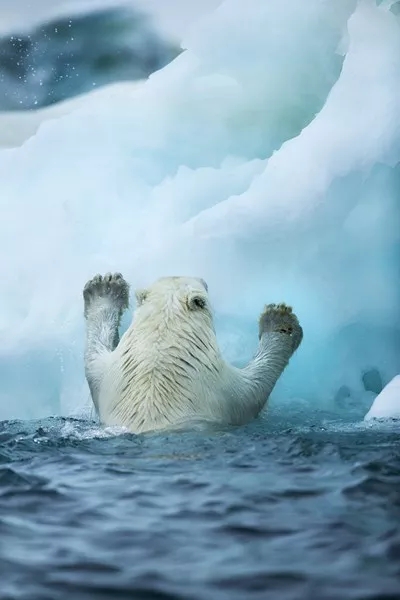 在另一片浮冰邊上,還有一只奄奄一息的北極熊,正試圖奮力地爬上浮冰