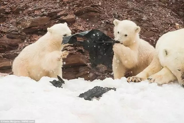 兩只小北極熊把一塊黑色塑料當(dāng)成了玩具