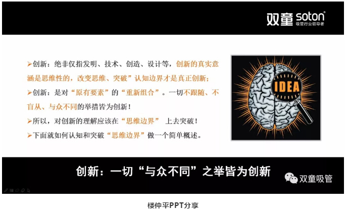 在傳統(tǒng)的認(rèn)知當(dāng)中,類似于吸管這樣的產(chǎn)品是典型的“低、小、散、弱”傳統(tǒng)邊緣產(chǎn)品。但“雙童”用創(chuàng)新的思維不斷努力,將一根小吸管做出各種花樣,顛覆了吸管就是喝飲料的傳統(tǒng)認(rèn)知!樓仲平也引導(dǎo)經(jīng)營(yíng)戶們創(chuàng)業(yè)就是打破“固有”創(chuàng)造“未有”,用創(chuàng)新的思維去做產(chǎn)品、做事業(yè),用科學(xué)的發(fā)展觀去思考,一定能改變自己乃至于整個(gè)企業(yè)的命運(yùn)!