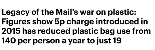 “根據(jù)數(shù)據(jù)顯示,自2015年推出對每個(gè)塑料袋征收5便士(約4.5毛)稅款法案后,英國的塑料袋使用量從人均每年140個(gè)降至19個(gè)!”