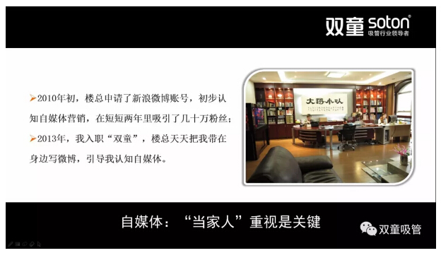 2010年后,自媒體給“雙童”的品牌傳播帶來(lái)了極大的發(fā)展機(jī)遇?!半p童”當(dāng)家人樓仲平認(rèn)知到一個(gè)好的品牌并不是完全靠廣告砸出來(lái)的,中小企業(yè)可以通過(guò)塑造企業(yè)文化IP,講好企業(yè)的故事,形成品牌的傳播!