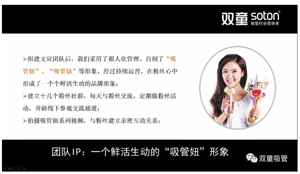 組建文宣團(tuán)隊(duì)后,我們采用了擬人化管理,自創(chuàng)了“吸管妞”、“吸管妹”等形象,經(jīng)過(guò)持續(xù)運(yùn)營(yíng),在粉絲心中形成了一個(gè)個(gè)鮮活生動(dòng)的品牌形象。同時(shí),建立十幾個(gè)粉絲社群,每天與粉絲交流,定期做粉絲活動(dòng),與粉絲親密互動(dòng)。