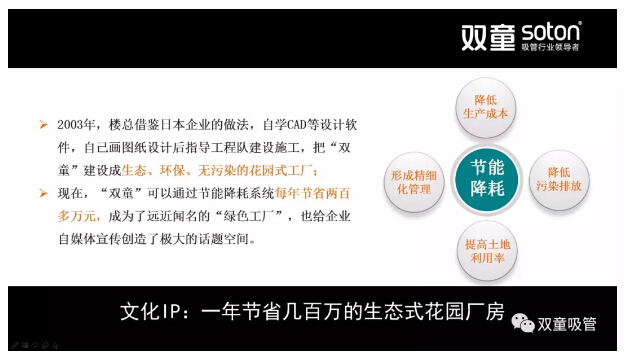 2003年,“雙童”借鑒日本企業(yè)的做法,在建廠之初建設(shè)的雨水收集等節(jié)能降耗設(shè)施,每年省下兩百多萬(wàn)元,成為了遠(yuǎn)近聞名的“綠色工廠”。在節(jié)約資源、節(jié)省成本的同時(shí),這些舉措也給企業(yè)自媒體宣傳創(chuàng)造了極大的話題空間。