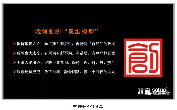接著,樓仲平用一句話做展開:知“死”而后生。一個企業(yè)唯有始終保持危機感,才能不斷的成長,否則隨時會死掉。我們所有的一切都在大自然的規(guī)律中,在宇宙之下演繹生成。而商業(yè)的本質(zhì)也是基于自然生態(tài)共生規(guī)律下,所以在經(jīng)營當中,唯有大家知道了規(guī)律,才會更進一步成長。