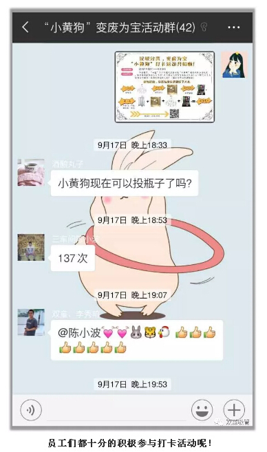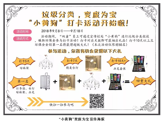 這次活動的參與方式也是十分的簡單,在活動期間內(nèi),“雙童”員工們只需將日常生活中的垃圾分類后投放至“小黃狗”,獲取相應(yīng)環(huán)保金即可進行打卡。而打卡相應(yīng)天數(shù)就能兌換相應(yīng)的獎品。