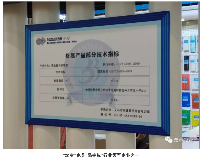 義博會(huì)現(xiàn)場(chǎng),20余家“品字標(biāo)”行業(yè)領(lǐng)軍企業(yè)集中亮相,“雙童”也是其中之一?!半p童”展區(qū)不僅展示了琳瑯滿目的吸管產(chǎn)品,而且在最耀眼的位置擺放了組委會(huì)頒發(fā)的亮標(biāo)牌及產(chǎn)品技術(shù)指標(biāo)牌,讓來(lái)往的客商們第一時(shí)間了解到“雙童”產(chǎn)品參數(shù)及品質(zhì)。