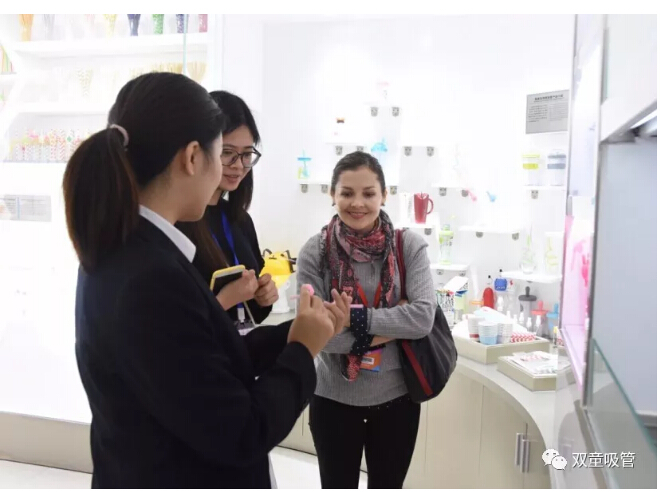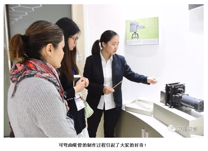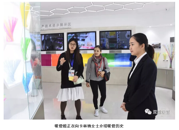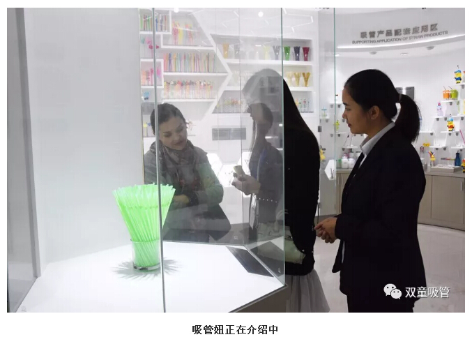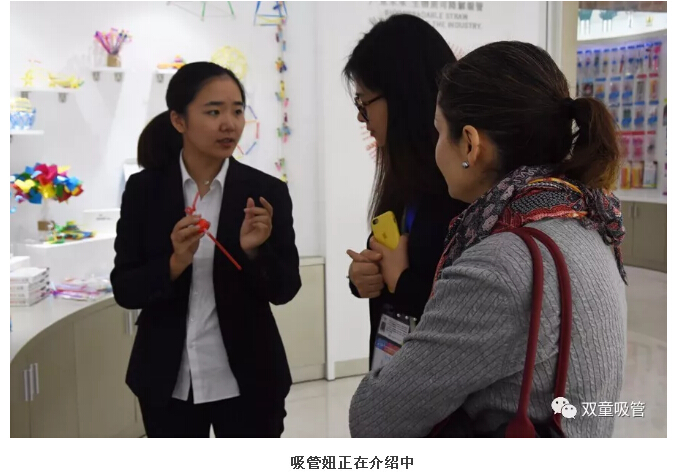 接著,卡林納女士被“雙童”創(chuàng)新產(chǎn)品體驗(yàn)區(qū)的產(chǎn)品吸引住了,在聽了吸管妞對卡通吸管、小鳥吸管、眼鏡吸管、愛心吸管、哈哈吸管的一番介紹后,她也是覺得十分的不可思議,一根吸管竟能玩出這么多的花樣!