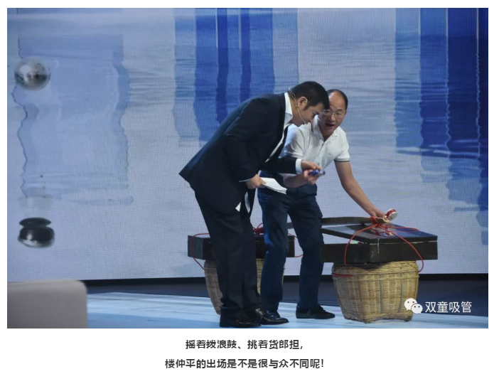 相比于其他兩位嘉賓,“雙童”樓仲平的出場(chǎng)方式可算是最“與眾不同”啦!看,當(dāng)主持人“鷗哥”邀請(qǐng)樓仲平出場(chǎng)時(shí),他竟然搖著撥浪鼓、挑著貨郎擔(dān),口里還喊著“雞毛鴨毛甲魚(yú)殼收啊……”就上場(chǎng)了!