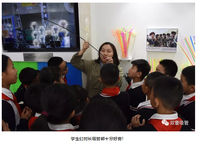 進(jìn)入吸管博物館后,琳瑯滿目的吸管讓孩子們十分歡喜,大家?guī)е鴿M滿的好奇心緊跟吸管妹妹身后,深怕錯(cuò)過了關(guān)于吸管的“秘密”!來到長(zhǎng)吸管區(qū)域時(shí),“超長(zhǎng)吸管”更是讓孩子們驚奇不已:“原來還有這么長(zhǎng)的吸管呀!”