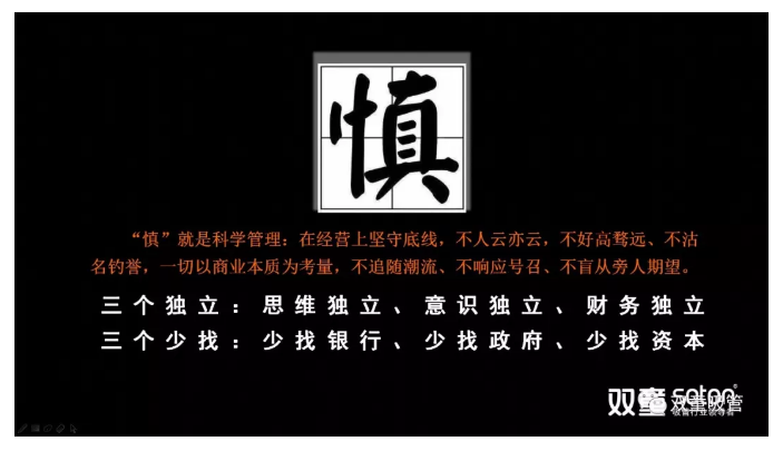 更深層次講,“慎”是慎獨,也就是說中國經(jīng)濟發(fā)展到今天,企業(yè)在發(fā)展過程中不能像粗放時期一樣完全追求規(guī)模、追求占有、追求薄利多銷……