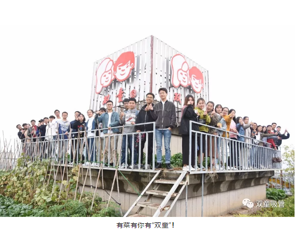 按照同學(xué)們的慣性,當(dāng)然是必拍一張大合照啦!但是“空中菜園”上如何能夠拍攝大合影呢?這不,同學(xué)們自己想了個高招,所有人都站在了菜園最高處,有”雙童“LOGO,有綠色蔬菜,有你,有我,真是一張”會說話的照片“!