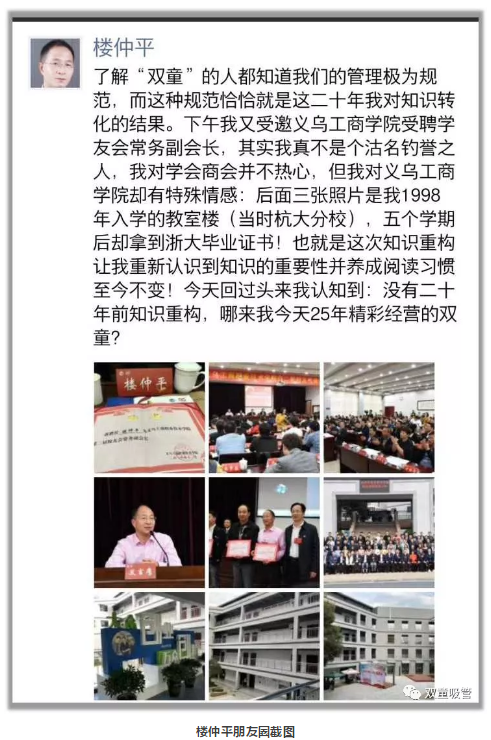 近日,在義烏工商職業(yè)技術(shù)學(xué)院建校25周年的校友代表大會上,“雙童”樓仲平作為首批畢業(yè)生也受邀參加并當(dāng)選了義烏工商學(xué)院校友會常務(wù)副會長,還作為校友代表進(jìn)行了發(fā)言!
