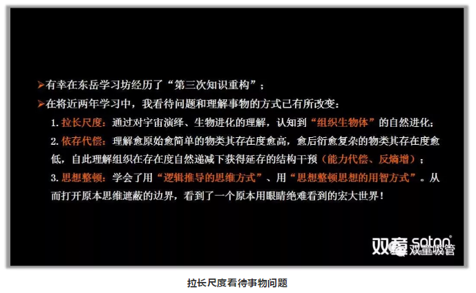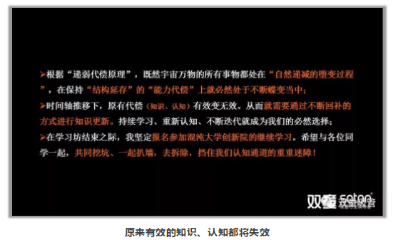 樓仲平深刻意識到,在巨變時代下,僅靠個人的努力、堅持和經(jīng)驗(yàn)是無法尋求創(chuàng)業(yè)道路上的突破。因?yàn)樵跁r間軸的推移下,原有的知識和認(rèn)知都會從有效變無效,我們需要拋棄固有認(rèn)知,持續(xù)學(xué)習(xí),重新認(rèn)知,不斷迭代。唯有如此,才能讓你的思維保持在最新的通道!