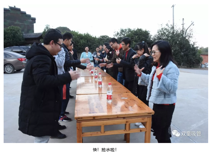 咦!這是發(fā)生了什么?原來,這是“雙童”人在一起在做團(tuán)建熱身活動(dòng)——搶礦泉水呢!