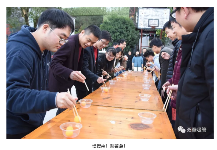 熱身活動(dòng)過后,迎來了“夾乒乓球”大賽。每個(gè)小組的隊(duì)員依次夾起乒乓球放入下一個(gè)人碗中,直到所有球都傳到最后一個(gè)人手中,率先完成的小組獲勝!
