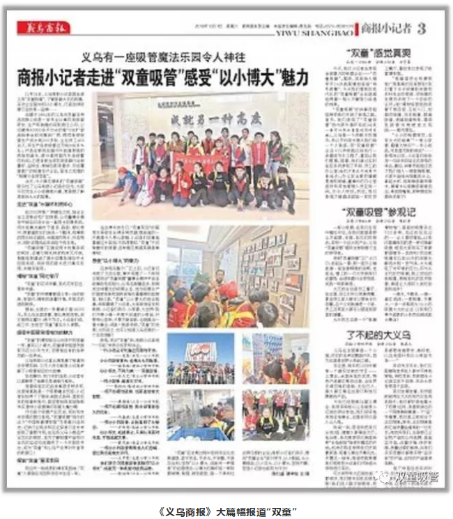 火了!火了!“雙童”又火了!近日,《義烏商報(bào)》的小記者團(tuán)來(lái)到“雙童”參觀,感受雙童“以小博大”魅力。參觀結(jié)束后,《義烏商報(bào)》對(duì)這座吸管魔法樂(lè)園進(jìn)行了大篇幅報(bào)道,究竟小記者們眼中的“吸管魔法樂(lè)園”有何魔力呢?快跟著吸管妞一起來(lái)看看吧!