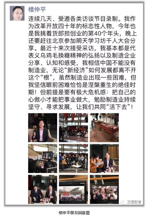 節(jié)目錄制結(jié)束之后,樓仲平也在朋友圈感言:連續(xù)幾天、受邀“改革開放40周年”訪談節(jié)目,我基本都是代表義烏雞毛換糖精神的弘揚(yáng)以及制造企業(yè)分享、認(rèn)知和感受,我相信中國(guó)不能沒(méi)有制造業(yè),無(wú)論“新經(jīng)濟(jì)”如何發(fā)展都離不開這個(gè)“根”,雖然制造業(yè)出現(xiàn)一些困難,但我堅(jiān)信眼前困難恰恰是涅槃重生的絕佳時(shí)期!但前提是要有極大危機(jī)感:把自己的心做小才能把事業(yè)做大,勉勵(lì)制造業(yè)持續(xù)堅(jiān)守、尋求發(fā)展,讓我們共同“活下去”!