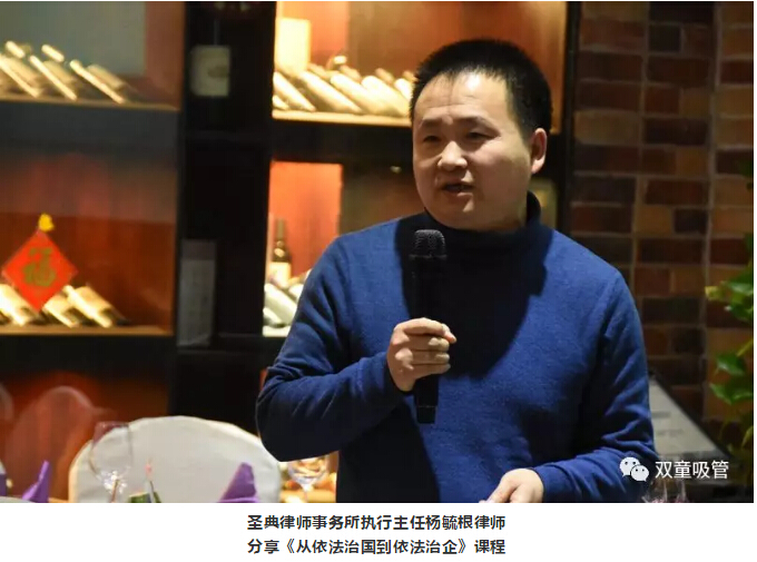 年會(huì)中的下一項(xiàng)議程,是由圣典律師事務(wù)所執(zhí)行主任楊毓根律師分享《從依法治國到依法治企》,楊毓根律師首先也和大家分享了從法律角度對(duì)“慎”字的理解,并結(jié)合事例向大家分享了為何要推動(dòng)依法治國和依法治企,以及依法治企的重要性!