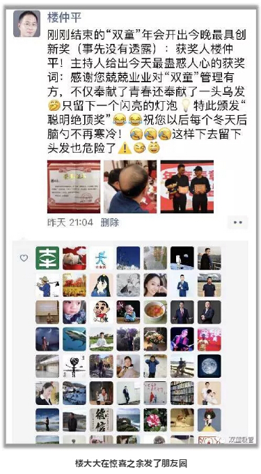 榮譽(yù)證書:樓仲平,感謝您這些年的兢兢業(yè)業(yè),對“雙童”管理有方,不僅奉獻(xiàn)了青春,還奉獻(xiàn)了一頭的烏發(fā),只留下一個(gè)閃亮的燈泡!特此頒發(fā)“聰明絕頂獎(jiǎng)”,祝您以后的每一個(gè)冬天,后腦勺不再寒冷!