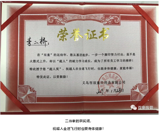 榮譽(yù)證書:李二橋,在“雙童”的這些年,您從基層起步,一步一個(gè)腳印努力付出,雖不是火箭式上升,卻以“超人”的耐力學(xué)習(xí)成長,成為了所有員工學(xué)習(xí)的榜樣!特此授予您“超人獎(jiǎng)”,祝超人在全速飛行時(shí),也能身體健康,家庭幸福!