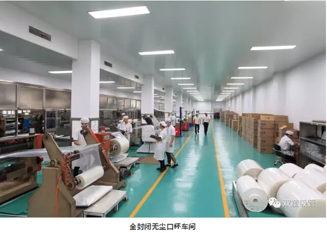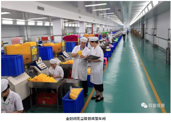 進入車間內部,一列列整齊的機器、一箱箱五顏六色的吸管、一條條清晰分明的分界線,車間內全部安裝了恒溫空調,所有員工皆穿著潔白的工作服進行生產工作。