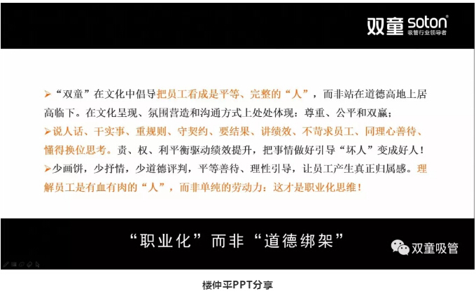 在看完樓仲平的視頻之后,可能很多人會(huì)心存疑慮:“雙童”明明是倡導(dǎo)"家文化"的企業(yè),竭盡所能對(duì)員工好,為什么不能讓員工在企業(yè)里談人情、感恩和奉獻(xiàn)呢,這難道不矛盾嗎?