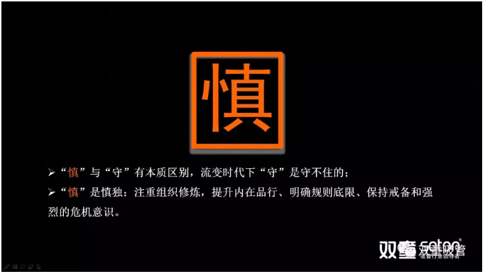 緊接著,樓仲平圍繞“慎”一詞和大家展開分享。流變時代下,“守”是守不住的。對企業(yè)來說,要認(rèn)識到這個時代給我們帶來的巨變沖擊,并知道自己的不足和短板,所以,“慎”是保持謹(jǐn)慎、戒備和危機。