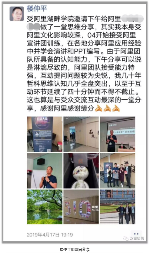 在提前一個月預(yù)約樓仲平課程的過程中,阿里巴巴方也希望樓仲平講一些能夠促進(jìn)內(nèi)外思維碰撞的課程,這也正好與樓仲平近年來的課程主題十分吻合。因此,對于再次和阿里巴巴結(jié)緣,樓仲平也在朋友圈里感慨到:感謝阿里感謝緣分!
