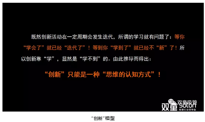 經(jīng)過前兩個“思維模型”的鋪墊,最后,樓仲平引導(dǎo)大家認(rèn)知:昨天還是“創(chuàng)新”的東西,今天就未必還是“新”。所以,“創(chuàng)新”是有“時(shí)間軸”的,隨著“時(shí)間軸”不斷后移,原有的“創(chuàng)新”有效變成了無效,創(chuàng)新活動也就“無窮無盡”!